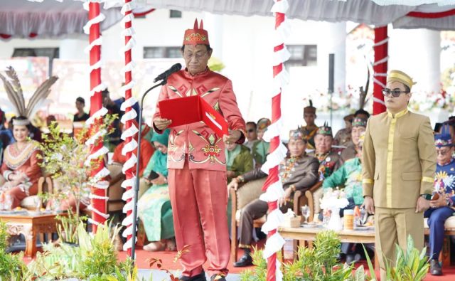 PURUK CAHU – Wakil Ketua II Dewan Perwakilan Rakyat Daerah (DPRD) Kabupaten Murung Raya (Mura), Likon, hadir dan bertugas membacakan UUD 1945 pada upacara peringatan Hari Jadi ke-23 Kabupaten Murung Raya yang digelar di halaman Kantor Bupati Mura, Puruk Cahu.