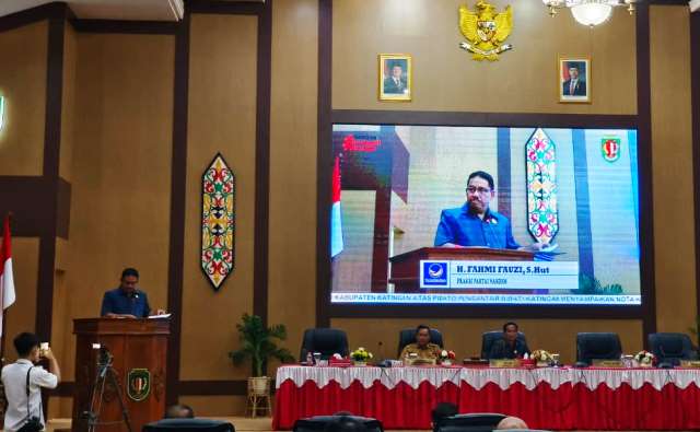 KASONGAN – Fraksi Partai Nasional demokrat (NasDem) DPRD Kabupaten Katingan melalui Juru Bicaranya H. Fahmi Fauzi, S.Hut menyampaikan Pemandangan Umum terhadap Pengantar dan Keuangan atas Rancangan Peraturan Daerah (Raperda) Perubahan APBD Tahun Anggaran 2025 yang disampaikan oleh Bupati Katingan.