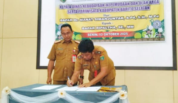 BUNTOK – Dinas Kebudayaan, Kepemudaan, Olahraga, dan Pariwisata (Disbudporapar) Kabupaten Barito Selatan (Barsel) menggelar acara Serah Terima Jabatan (Sertijab) dari Kepala Dinas sebelumnya, Dr. Manat Simanjuntak, kepada pejabat baru H. Ripaltha, di Aula Disbudporapar, Senin (13/10/2025).