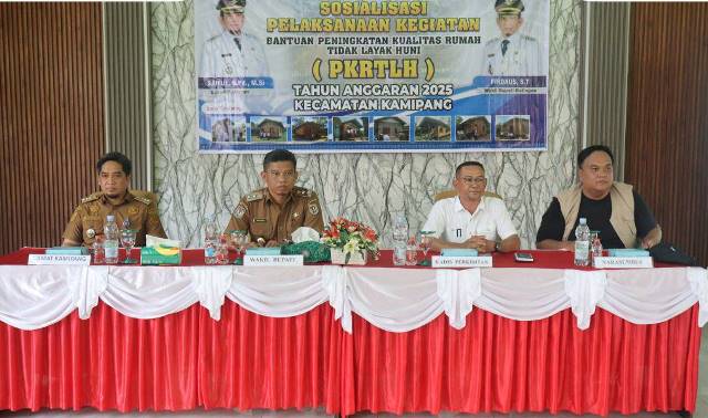 KASONGAN – Wakil Bupati Katingan, Firdaus, ST membuka Sosialisasi Calon Penerima Bantuan Peningkatan Kualitas Rumah Tidak Layak Huni (PKRTLH) Tahun Anggaran 2025 untuk wilayah Kecamatan Kamipang, pada Selasa (21/10/2025). Kegiatan yang digelar di Aula Kantor Kecamatan Kamipang tersebut, sekaligus dirangkai dengan penyerahan bantuan secara simbolis kepada perwakilan warga penerima.