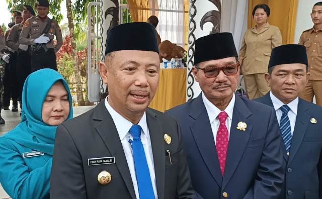 WAWANCARA - Bupati Kabupaten Barsel, Eddy Raya Samsuri usai upacara Peringatan hari Pahlawan ke-18 dan melakukan penaburan bunga di TMP Abdi Kencana Sababilah, Buntok, Senin (10/11/2025). (FOTO: KC5)
