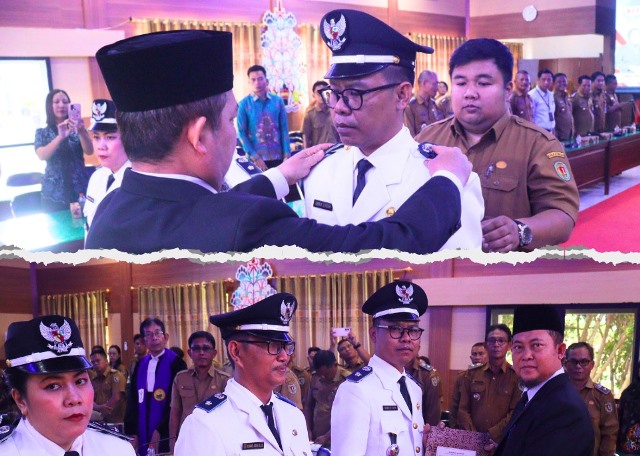PELANTIKAN - Bupati Katingan Saiful, S.Pd, M.Si saat memasangkan tanda jabatan kepada Kades Sabaung, Pj. Kades Buntut Bali dan Pj. Kades Tumbang Jala, Senin (26/01/2026) siang. (FOTO: IST)