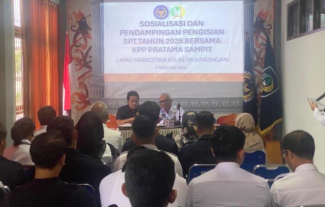 KASONGAN – Lembaga Pemasyarakatan (Lapas) Narkotika Kelas IIA Kasongan melaksanakan kegiatan Sosialisasi dan Pendampingan Pengisian SPT Tahunan melalui aplikasi Coretax bekerja sama dengan KPPN Sampit dan KPP Sampit, pada Rabu (04/02/2026). Kegiatan ini bertujuan, untuk meningkatkan pemahaman serta kepatuhan pegawai dalam melaksanakan kewajiban perpajakan secara tepat dan sesuai ketentuan.